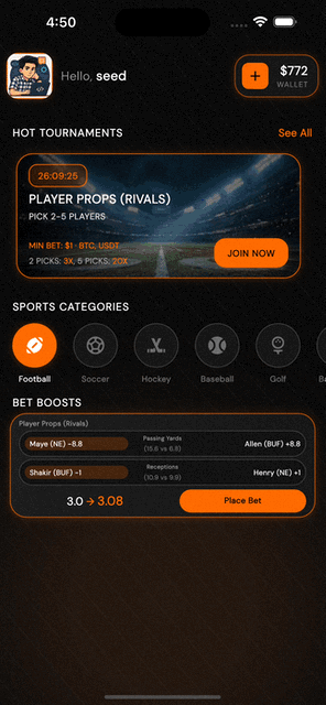 The platform combines rivals (player props or fantasy points), and crypto funding into a single experience that feels faster and more transparent.